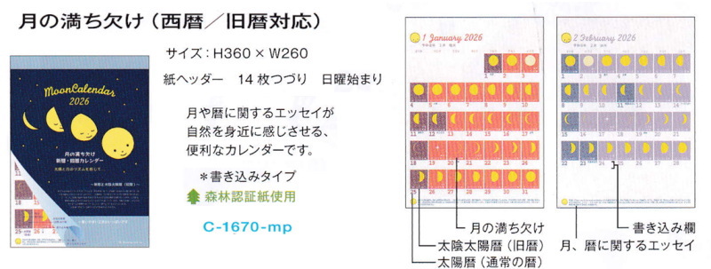 >>>月の満ち欠け2026年壁掛けカレンダー