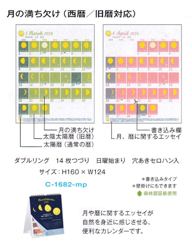 >>>月の満ち欠け2026年卓上カレンダー